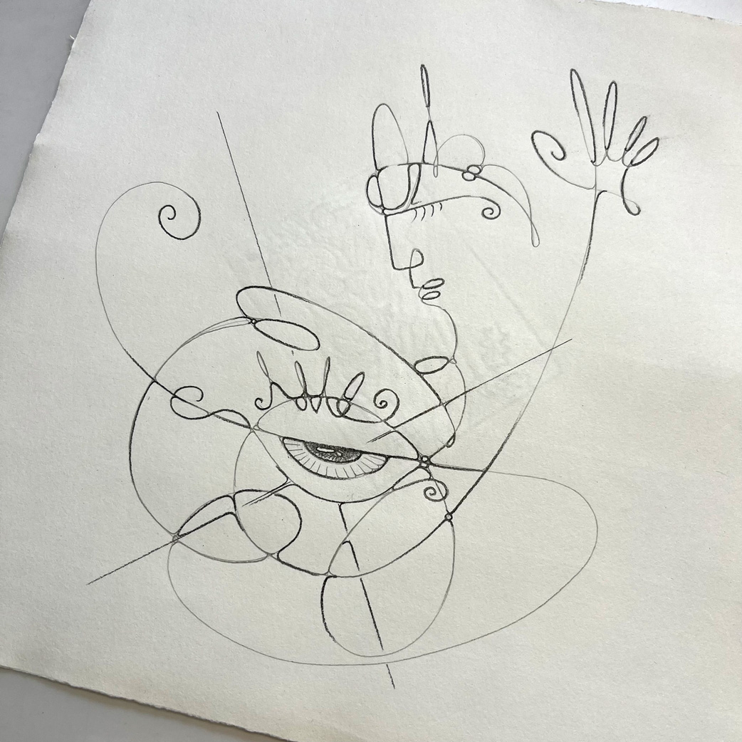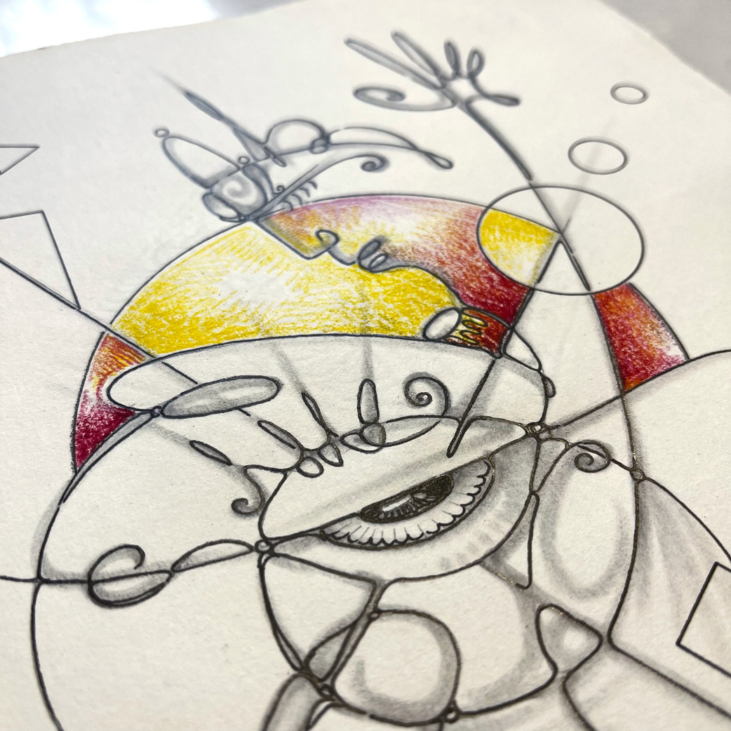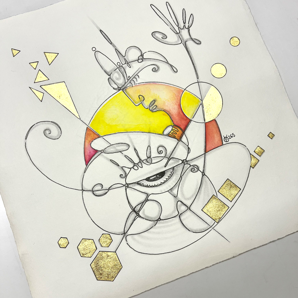 Bleistift, Tusche-Fineliner, Aquarellstift, Blattgold