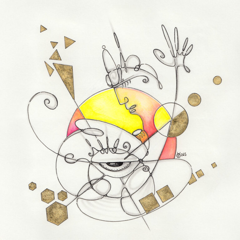 Bleistift, Tusche-Fineliner, Aquarellstift, Blattgold