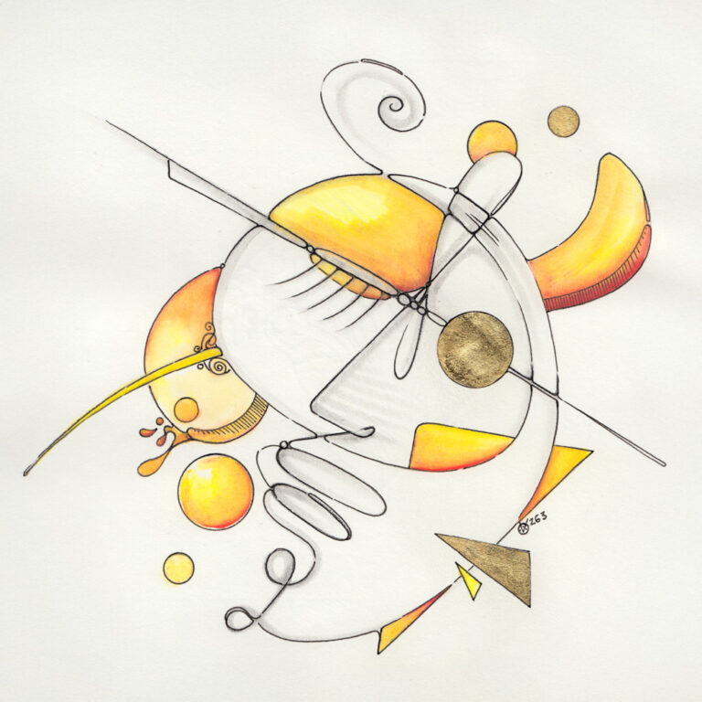 Bleistift, Tusche-Fineliner, Aquarellstift, Blattgold