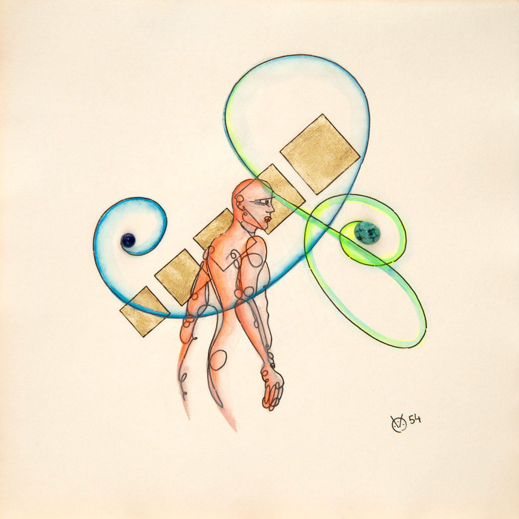 Identität Handgeschöpftes Büttenpapier 21,5 x 21,5 cm, Bleistift, Tusche-Fineliner, Aquarellstift, Acrylfarbe, Blattgold, Lapislazuli, Türkis Edelstein