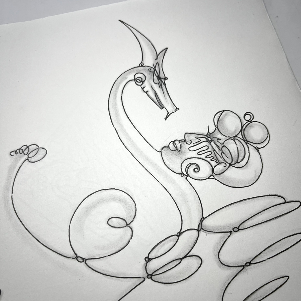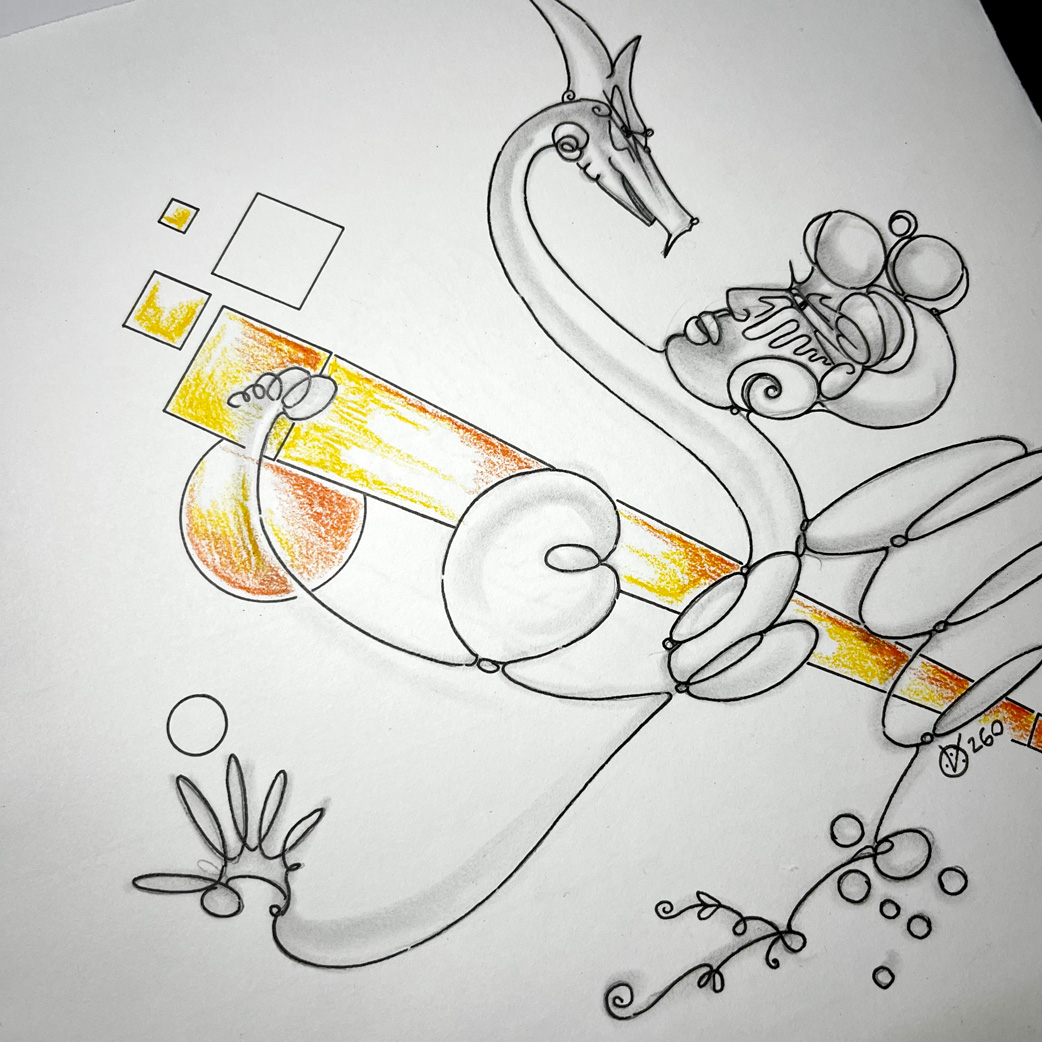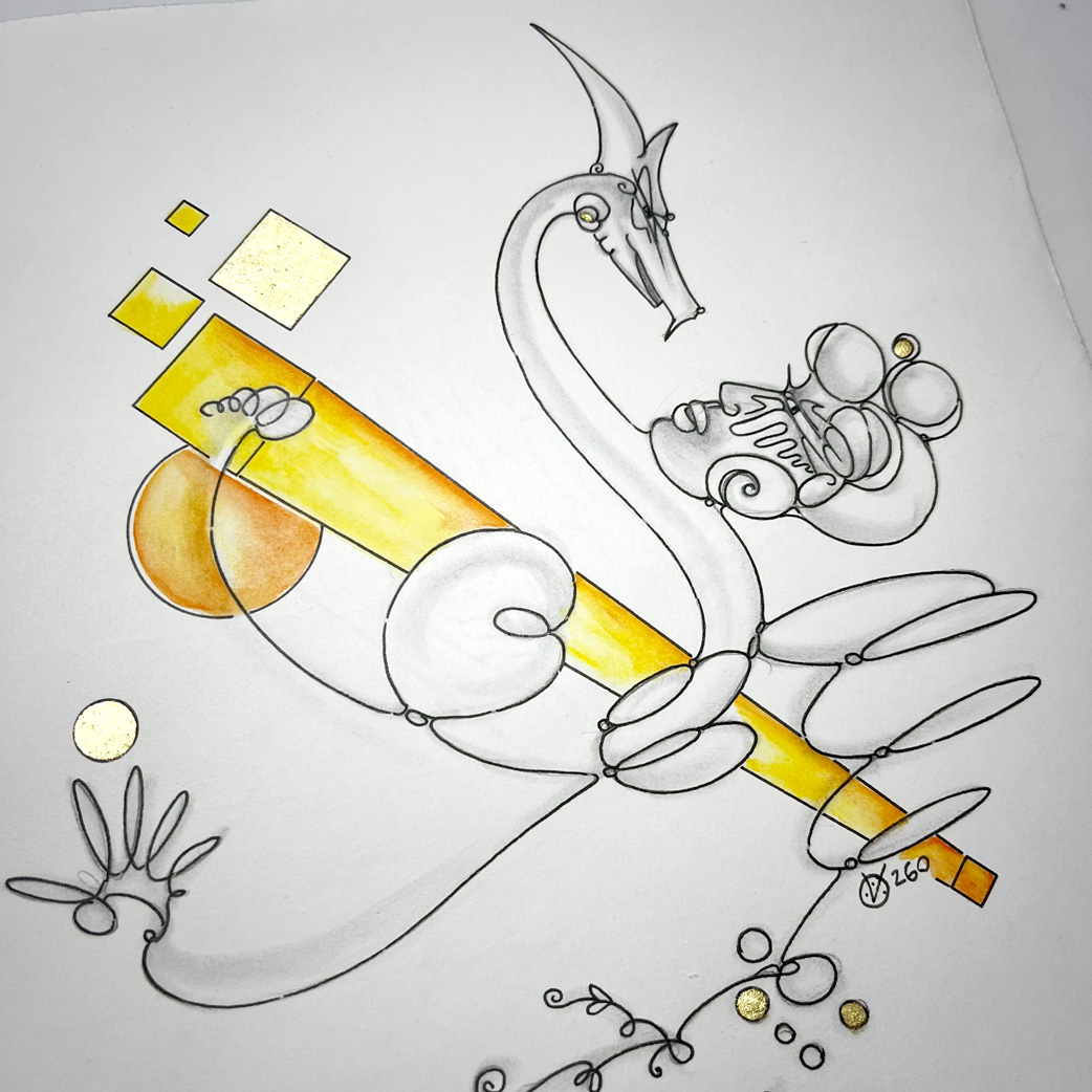Bleistift, Tusche-Fineliner, Aquarellstift, Blattgold