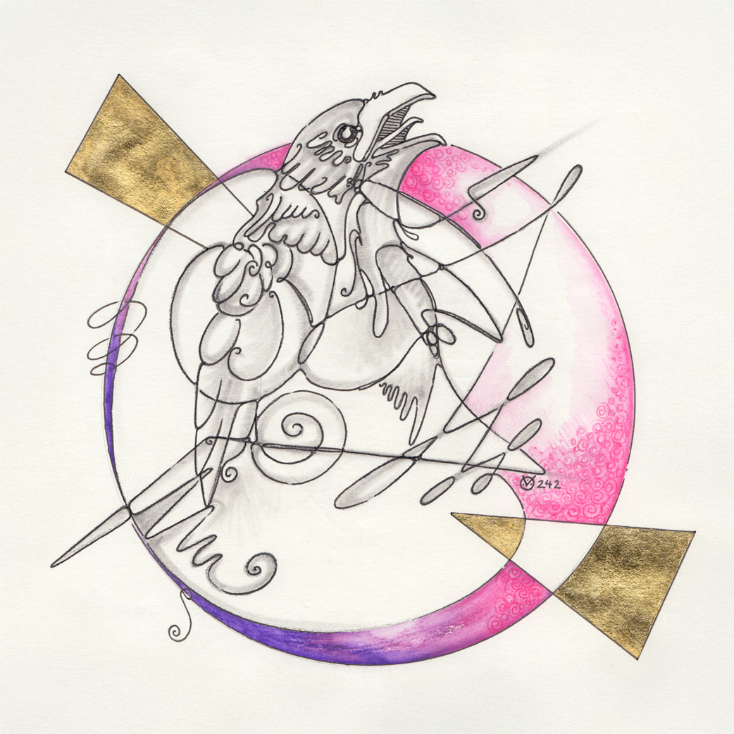 Bleistift, Tusche-Fineliner, Aquarellstift, Blattgold