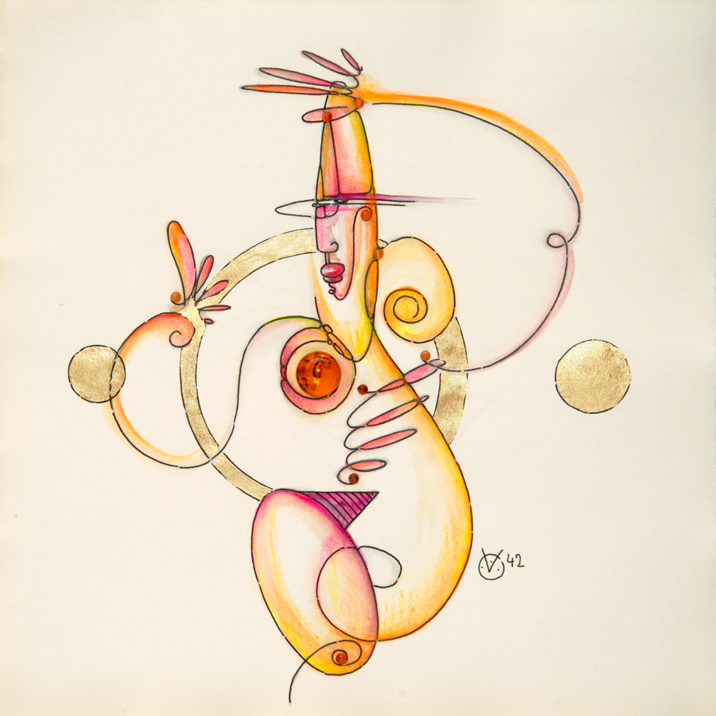 Sonnentanz Handgeschöpftes Büttenpapier 21,5 x 21,5 cm, Bleistift, Tusche-Fineliner, Aquarellstift, Acrylfarbe, Blattgold, Bernstein, Karneol Edelstein