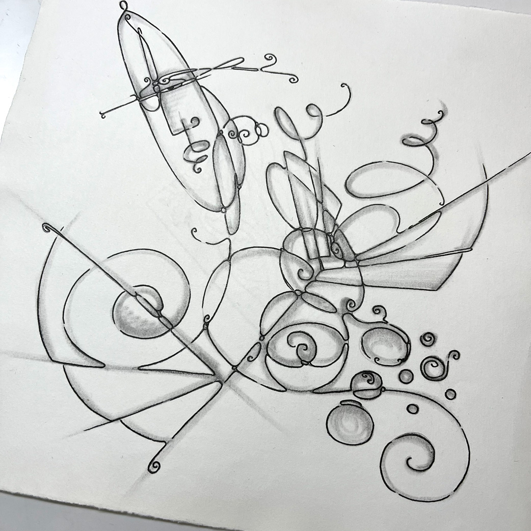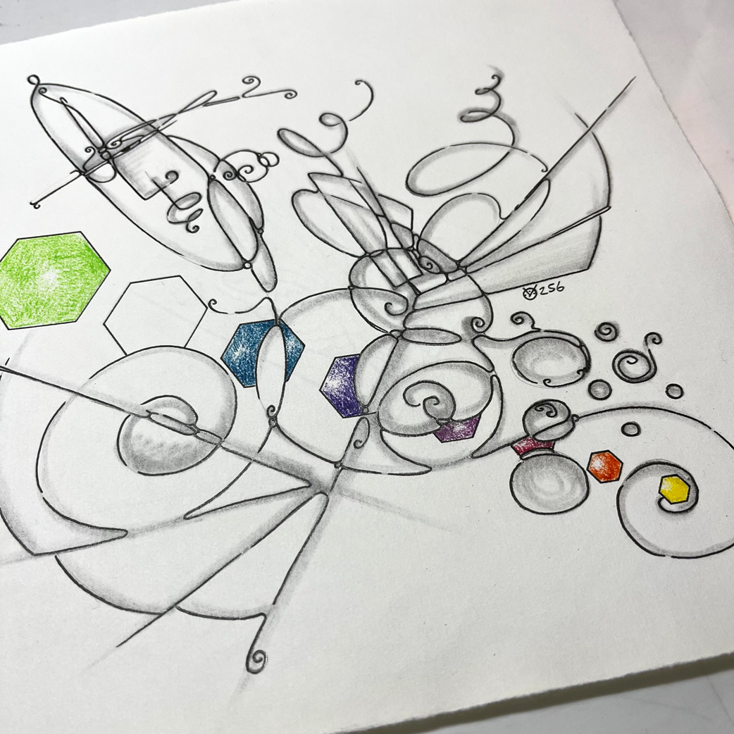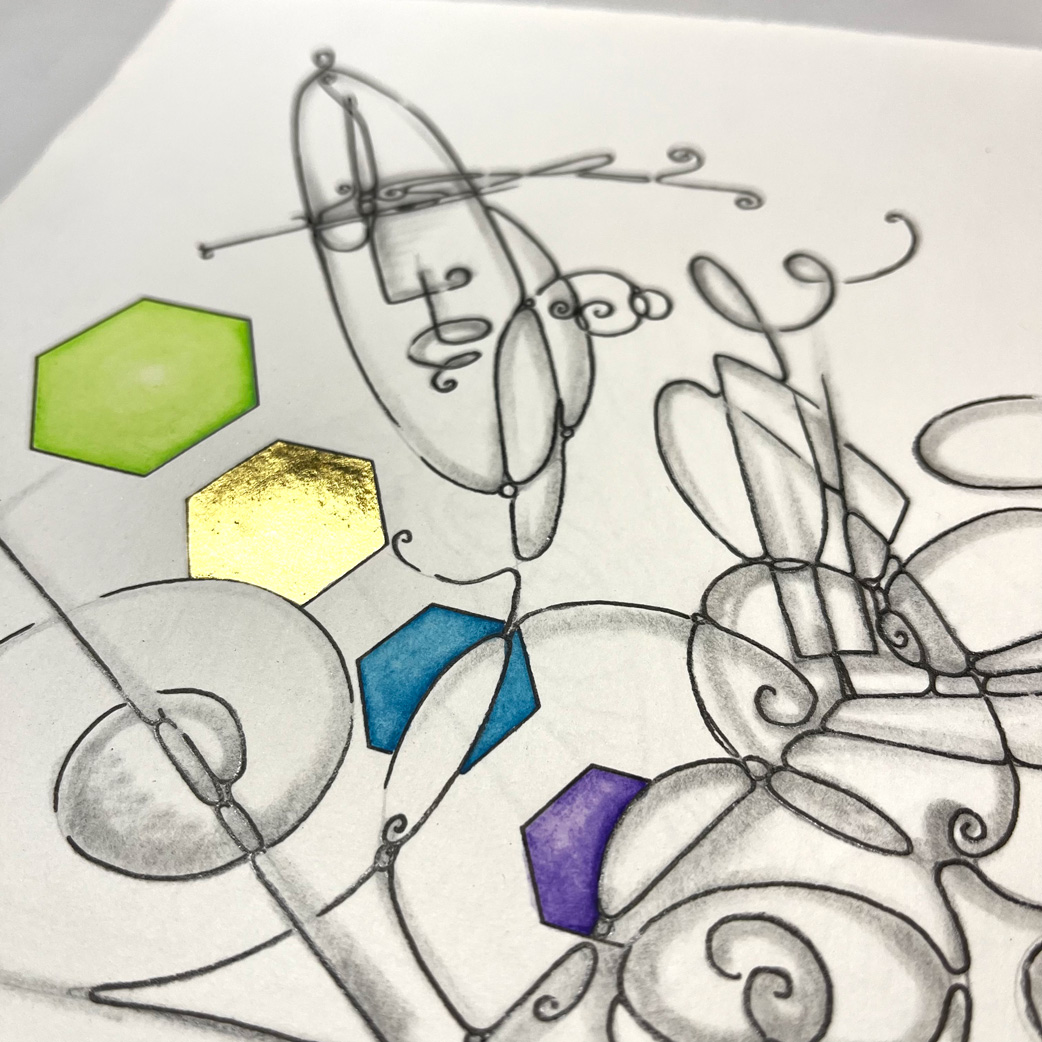 Bleistift, Tusche-Fineliner, Aquarellstift, Blattgold