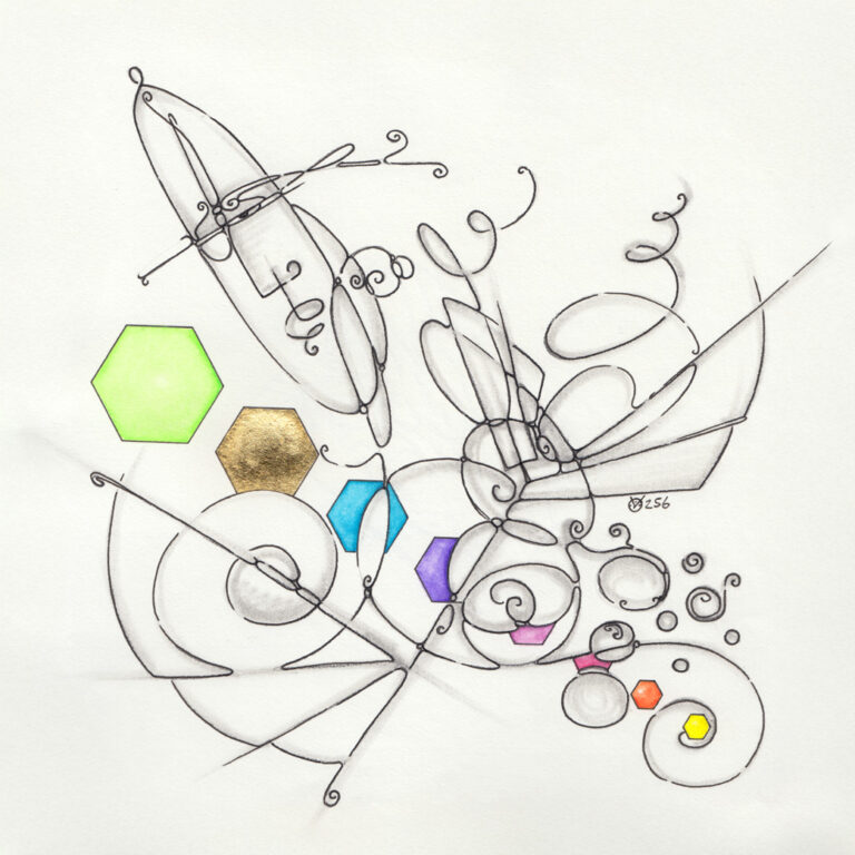 Bleistift, Tusche-Fineliner, Aquarellstift, Blattgold
