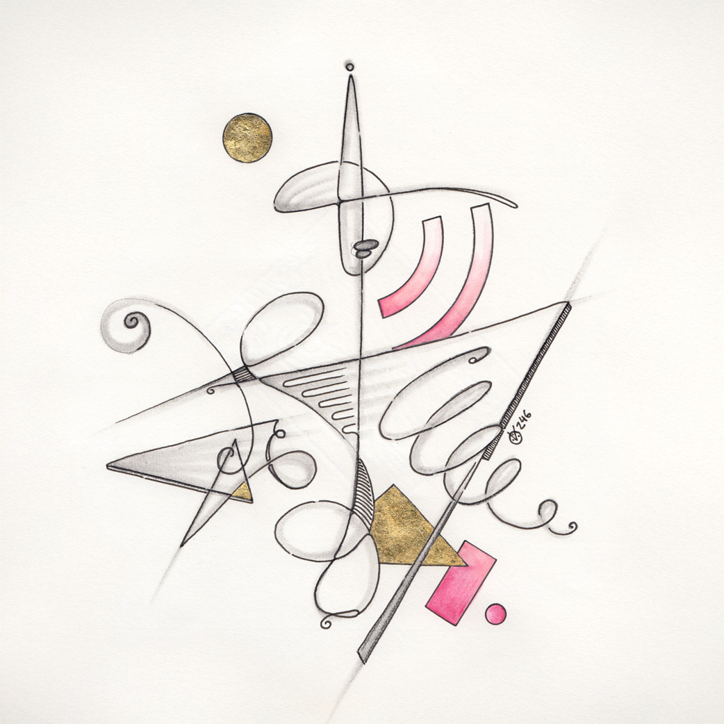 Bleistift, Tusche-Fineliner, Aquarellstift, Blattgold